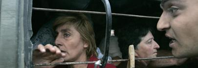 Lastwagen mit sechs Soldaten an Bord ab, um nicht in eine Menge hineinzufahren.