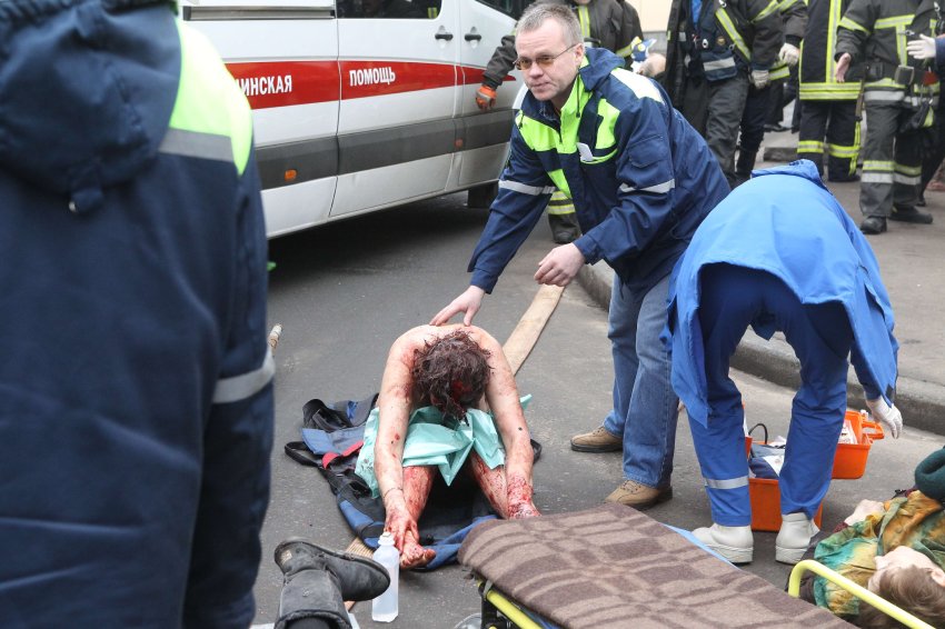 Helfer kümmern sich vor der Metrostation Park Kultury um eine blutende Frau: