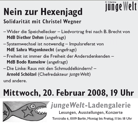 Berlin, den 20. Februar 2008 Diese Erklärung wurde auf einer Solidaritätsveranstaltung mit Christel Wegner am 20. Februar in Berlin verabschiedet. Sie kann bis zur Konstituierung des niedersächsischen Landtages Ende März im Internet (www.jungewelt.de), auf Listen und in der junge Welt-Ladengalerie (Torstraße 6, 10119 Berlin) unterzeichnen werden. Die Unterschriften werden danach an den Bundesvorstand der Partei Die Linke in Berlin und an den Landesvorstand in Niedersachsen übergeben. Kontakt: aktionsbuero@jungewelt.de ______________________ Name/Vorname ______________________ ________________________ Straße Postleitzahl/Ort ____________________________ Datum/Unterschrift