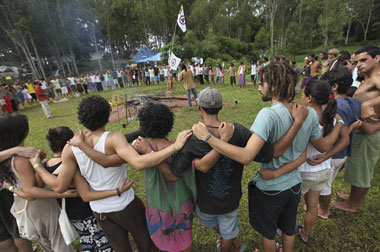 Indians gather to discuss the rights of indigenous peoples at the World Social Forum in Brazil. The WSF is an annual countercultural event to protest the World Economic Forum held annually in Davos, Switzerland.